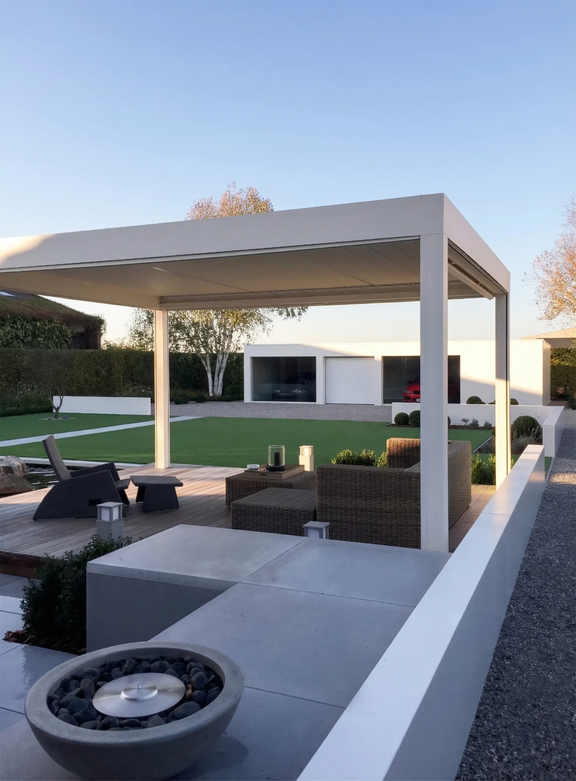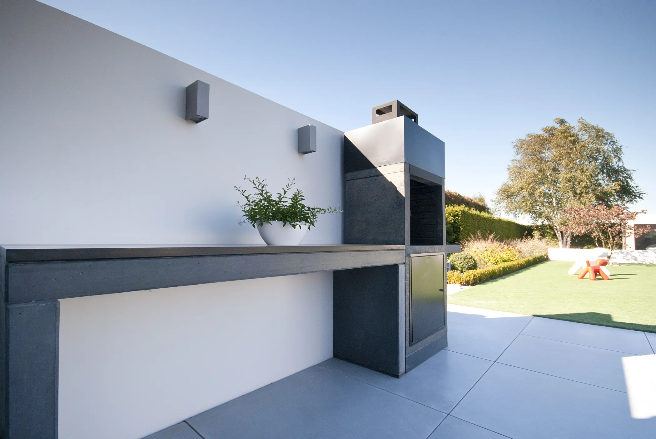 Subtiele luxe en functionaliteit gaan hier hand in hand: geïntegreerde verwarmingselementen, een sfeervolle vuurschaal, een barbecue-element met werktafel en een ondiepe architecturale waterpartij versterken de beleving van deze buitenruimte.
