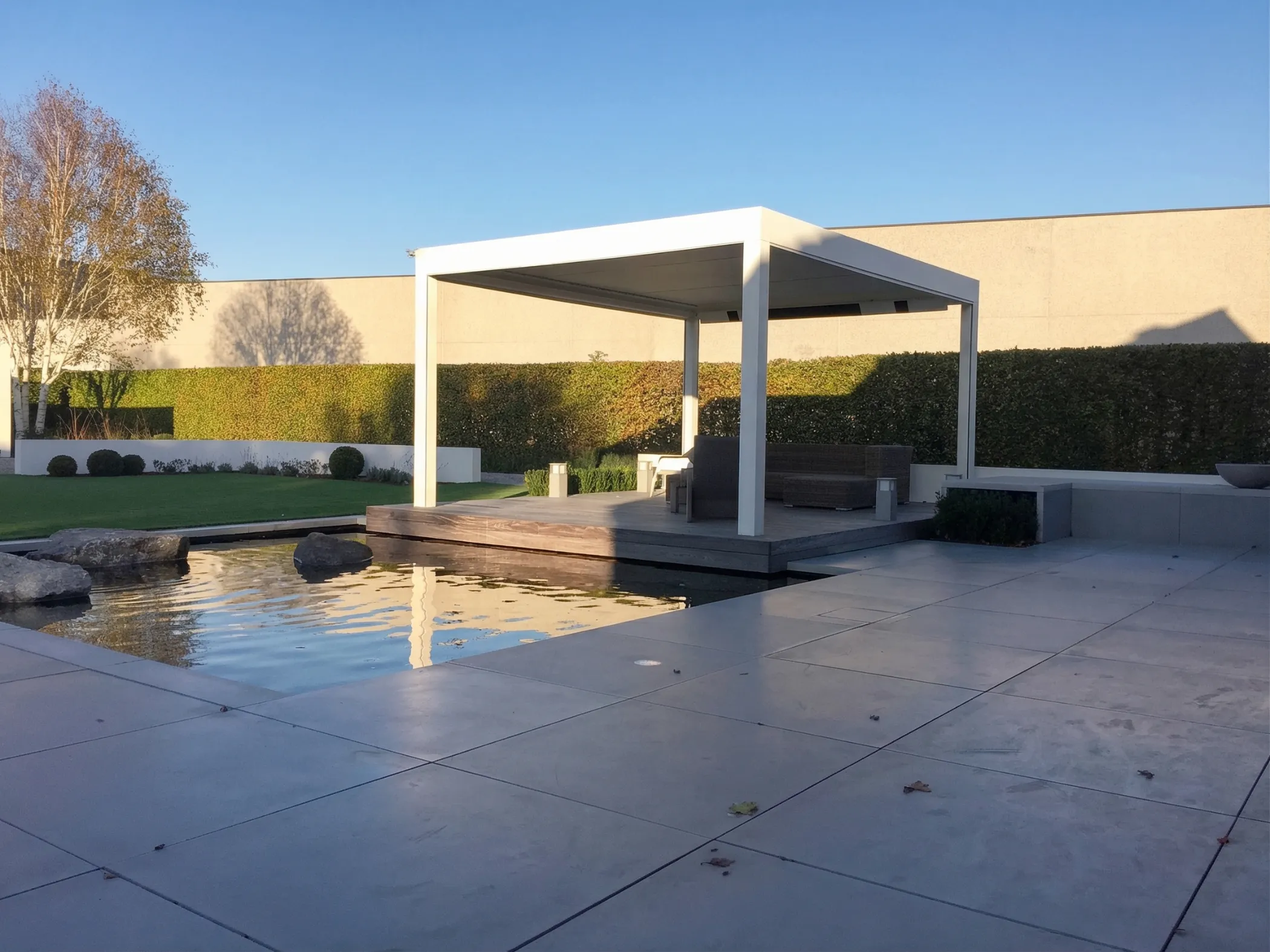 Aansluitend aan de woning werd een royaal terras in hoogwaardige tegels aangelegd, dat naadloos overgaat in een verhoogd houten loungeterras.