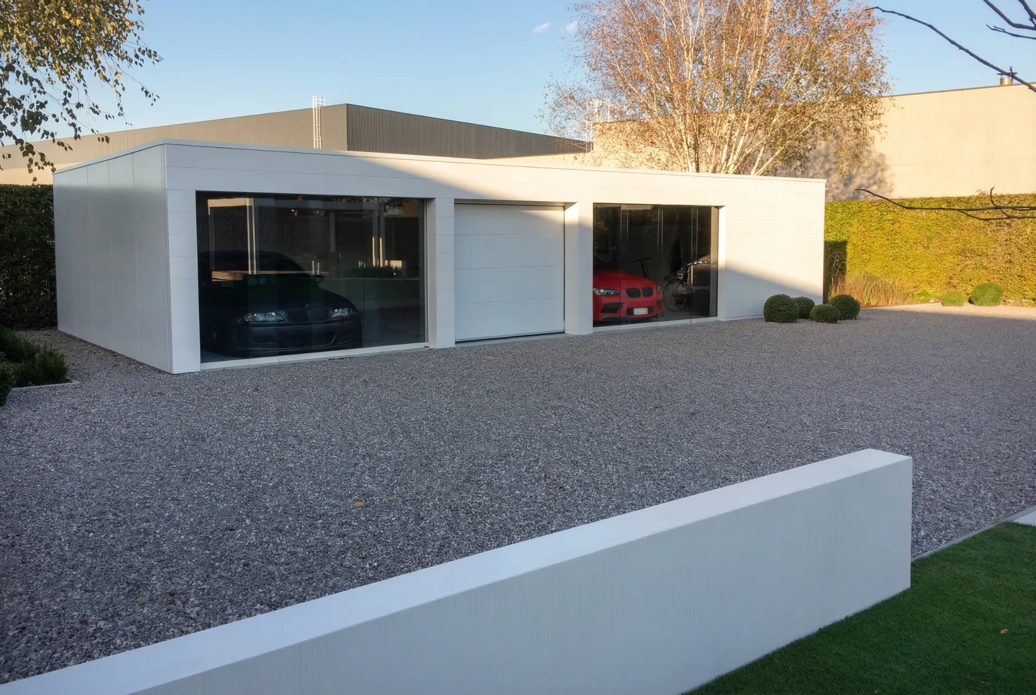 Transparante glasgordijnen en een centraal geïntegreerde sectionale poort geven het volume een lichte, elegante uitstraling.