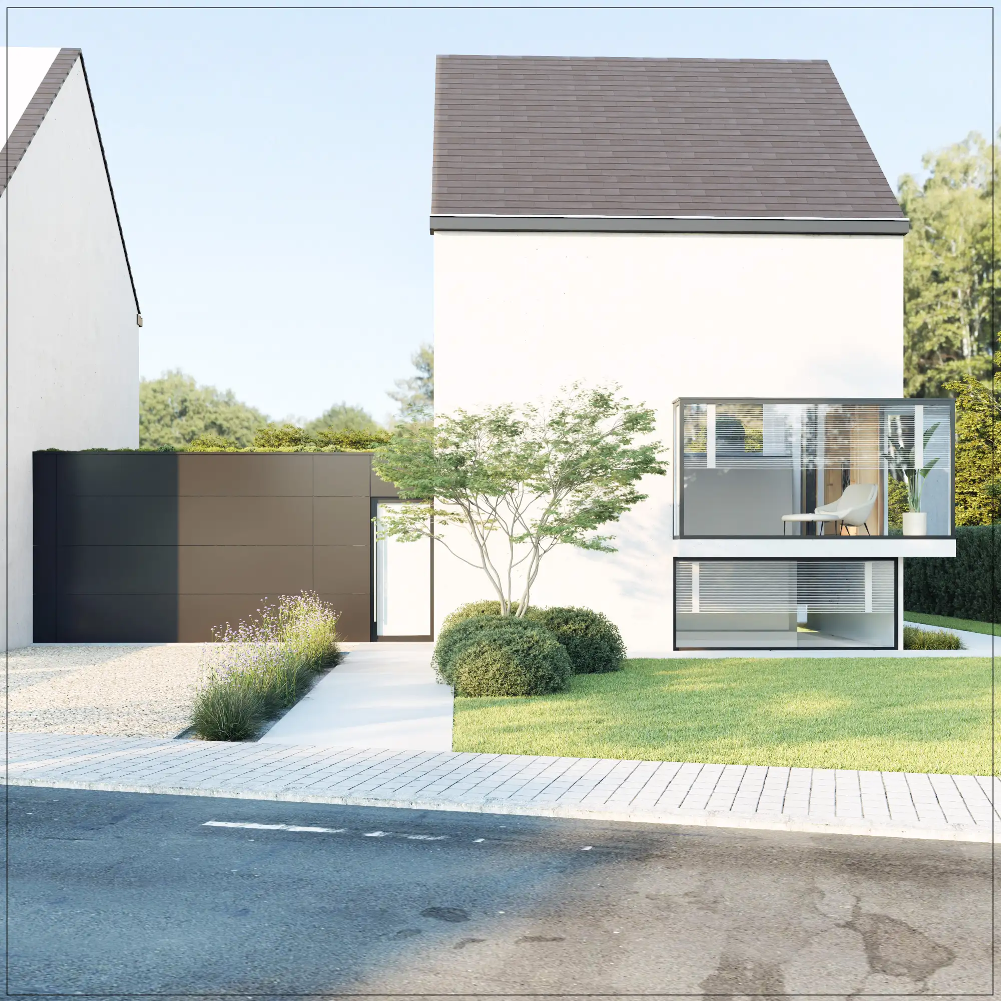 De zorgvuldig gekozen beplanting brengt structuur, seizoensbeleving en een groen kader dat de architectuur versterkt.