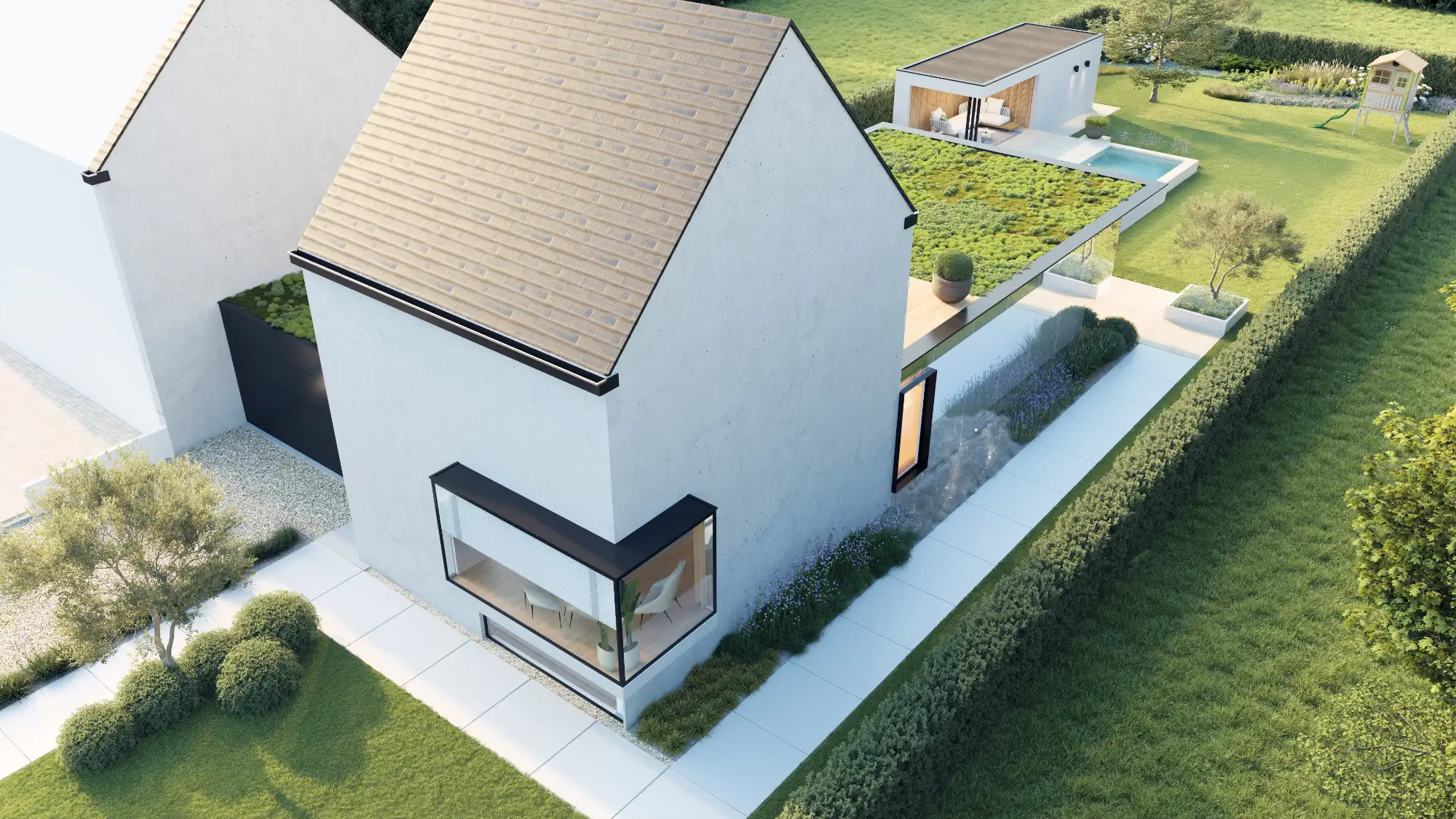 Ruime terrassen en subtiele tuinpaden verbinden de verschillende leefzones en zorgen voor een natuurlijke overgang tussen woning en tuin.